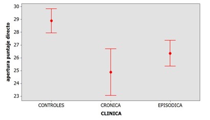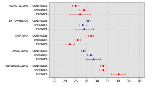 En lo que refiere a rasgos de personalidad, la apertura mostró la mayor diferencia, con una media de 28,8 (DE 6,7) para el grupo control, 26,3 (DE 5,8) para episódicas y 24,8 (DE 4,4) para migraña crónica. En el gráfico se muestran las medias con un intervalo de apertura estimado para la media real estableciendo un 95 % de índice de confianza (Figura 3).